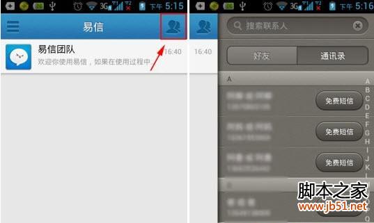 2、进入易信主页后点击右上角的”双人“头像,然后添加你要语音留言的好友。