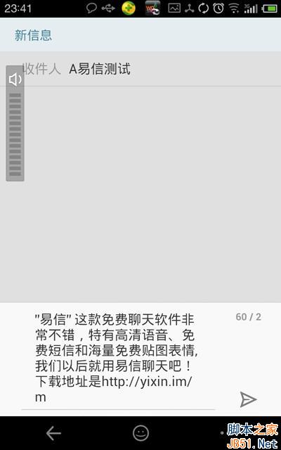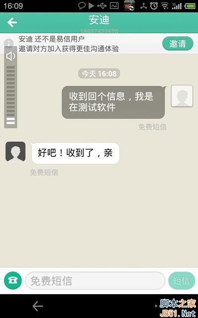 我尝试给朋友发一条信息。朋友即刻就回了信息,可以确定易信免费短信功能很实用、快捷。在对方没有安装易信的情况下,可以直接回信息到易信,免了去短信栏目查看的麻烦。据朋友反映,在短信结尾可以看到以“通过易信发送”为结尾的信息提示,这应该是copy当年飞信的模式。