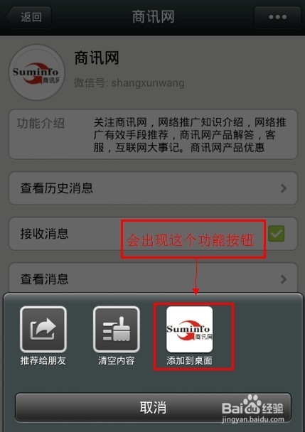 微信5.0公众号有一个新功能,就是可以把公众号的图标生成说面快捷方式。微信5.0新版并没有特别强调这个功能,这个功能被铺天盖地的打飞机游戏、表情和扫扫更健康等功能给淹没。