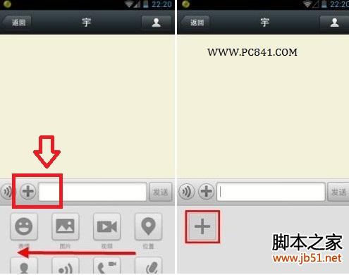 二、在安卓手机中安装了微信炫彩字插件之后,我们在进入手机微信,然后打开一个微信好友聊天窗口,我们点击一个加号图标,如下图所示: