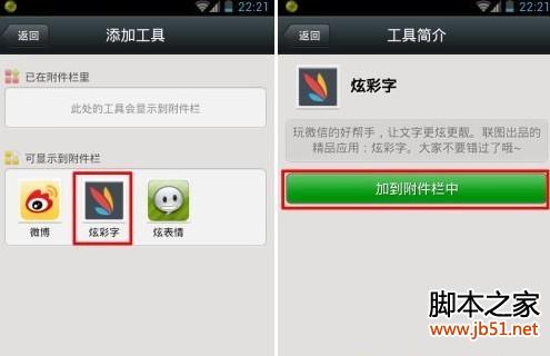 四、然后在弹出的添加工具中,即可看到我们开始在手机中安装的“炫彩字”微信插件了,我们选择它,然后在接下来的操作中,选择“加到附件栏”中,如下图所示: