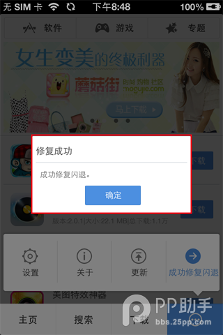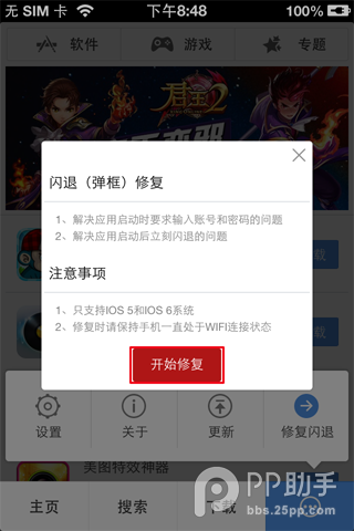 修复闪退:独有的软件闪退修复功能,闪退、弹窗不再烦。如软件运行过程中出现闪退现象,只需打开PP助手点击“闪退修复”按钮,即可轻松完成闪退修复。