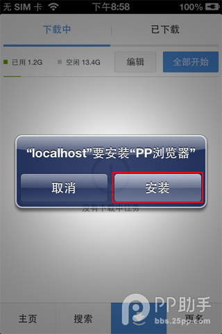 3.下载完成后PP助手(正版)提示是否安装应用程序 -- 点击确认 -- 桌面会生应用程序图标 -- 等待安装完成