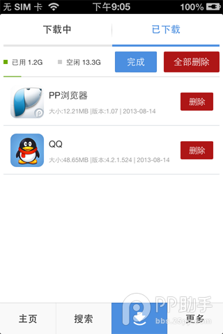 4.安装完成PP助手(正版)不会自动删除安装包,请手动进入PP助手(正版)下载 -- 已下载--编辑--点击删除按钮(或点击全部删除按钮),然后点击“完成”按钮即可以完成删除。
