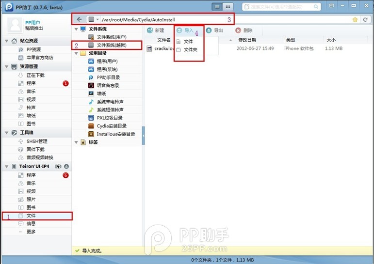 2.将手机连接电脑打开PP助手--文件--文件系统(越狱)--路径:/var/root/Media/Cydia/AutoInstall(将deb格式的Cydia插件导入。路径可以随便只要自己记住就可以。)