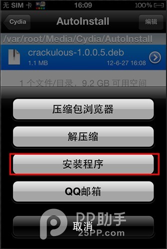 1.将手机连接电脑打开PP助手--文件--文件系统(越狱)--路径:/var/root/Media/Cydia/AutoInstall(将deb格式的Cydia插件导入。)