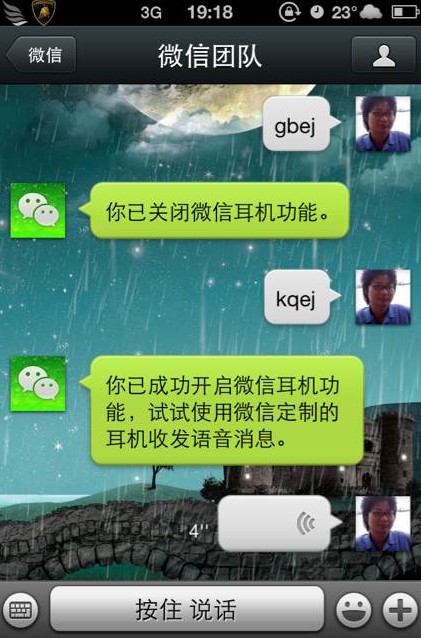 开启微信耳机发送语音功能:发送“kqej”四个字母(开启耳机首字母)到微信团队帐号即可,该功能是微信定制耳机专用功能,但是经本人实测,iPhone自带的耳机同样可以用!按中间的播放/暂停键就可以录音了,说完话再按一下就成功发送了!怎么关闭回复到按键播放音乐呢?如图,发送gbej就OK了!