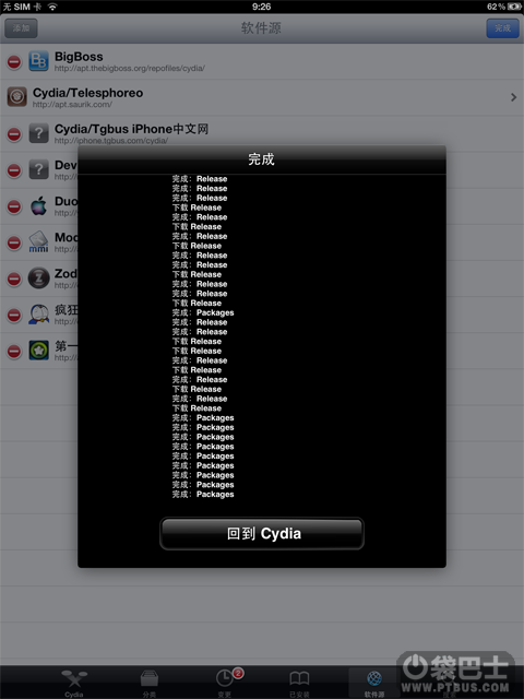 之后系统就会自动更新软件源,耐心等待几秒。然后点击回到Cydia.
