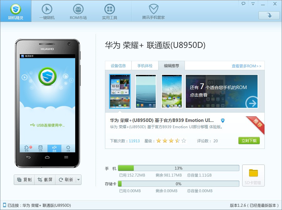 2) 在手机开机状态下打开刷机精灵,连接成功后刷机精灵首页显示手机机型等信息