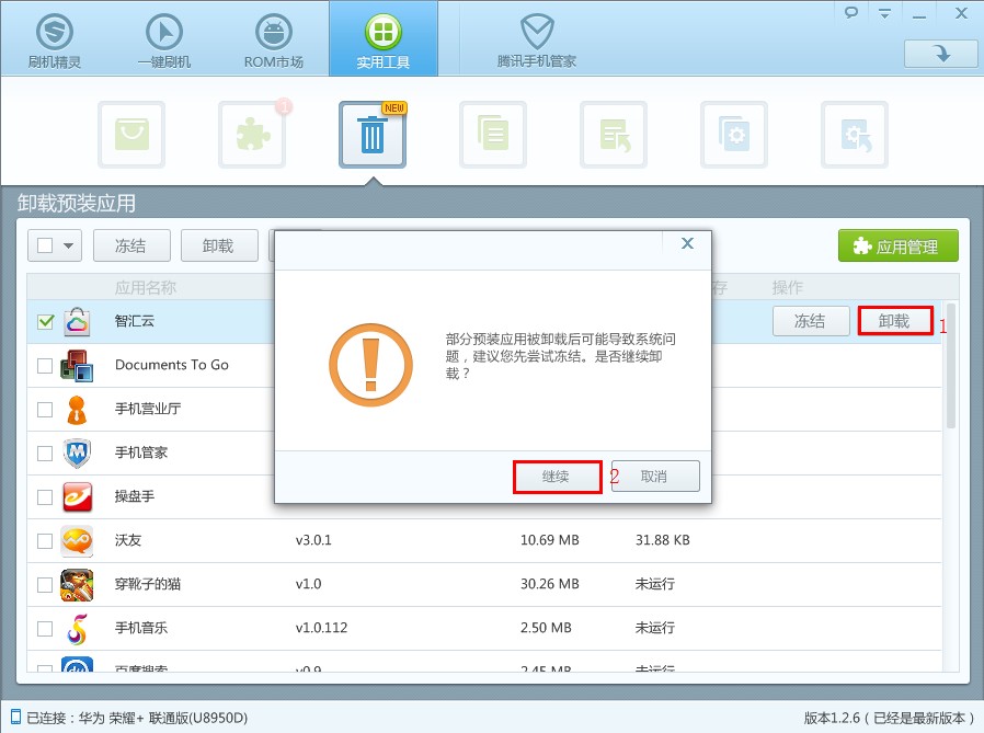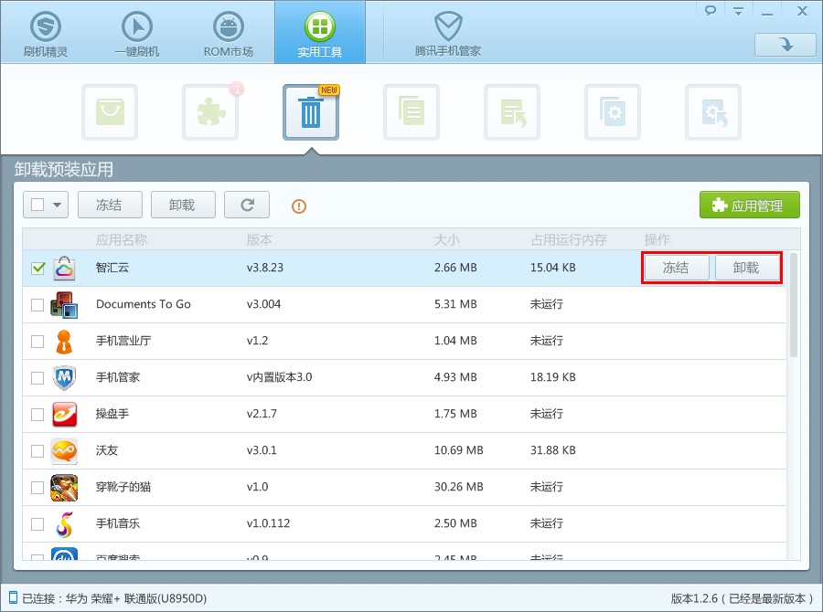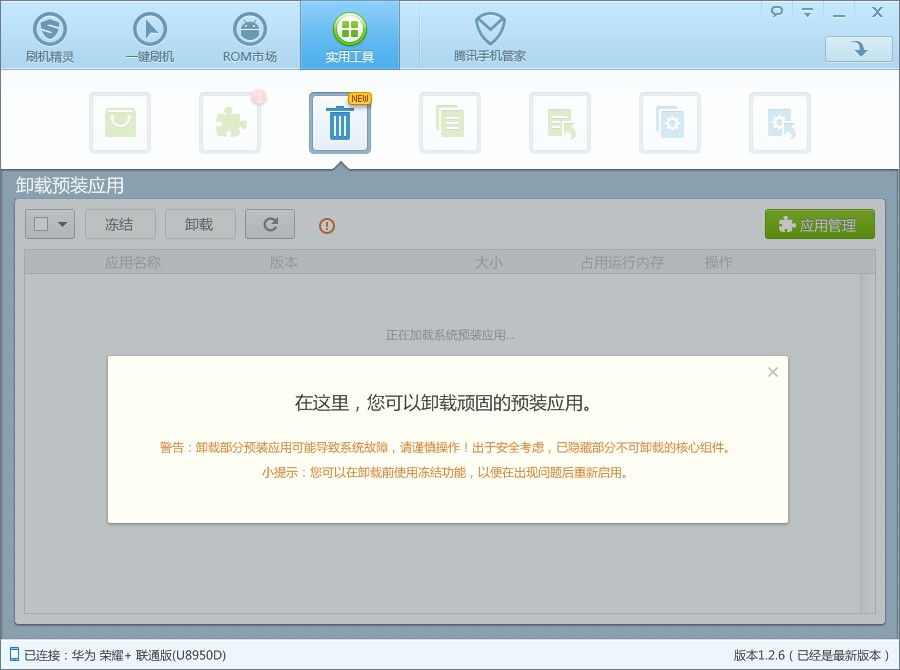 刷机精灵提供的卸载预装应用功能,通过简单的操作,让用户轻松卸载手机自带应用,释放内存空间,加速手机系统,延长手机待机时间,避免恶意软件产生的恶意扣费、恶意扣流量,甚至窃取用户个人隐私等危害。