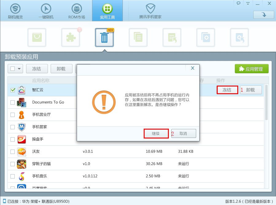 冻结应用:选择“冻结”,点击“继续”,完成冻结后提示“冻结成功”。冻结应用后可使用相同的操作对应用进行“解冻”