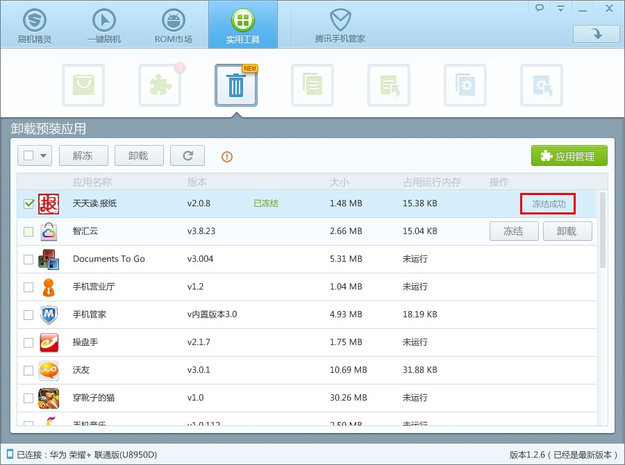 卸载预装应用功能还贴心地分为“冻结”和“卸载”两个选项,用户可选择直接卸载软件,也可选择冻结软件。“冻结”不会直接卸载应用,而应用冻结后将不再占用手机的运行内存,冻结应用后还可进行“解冻”,恢复应用运行。