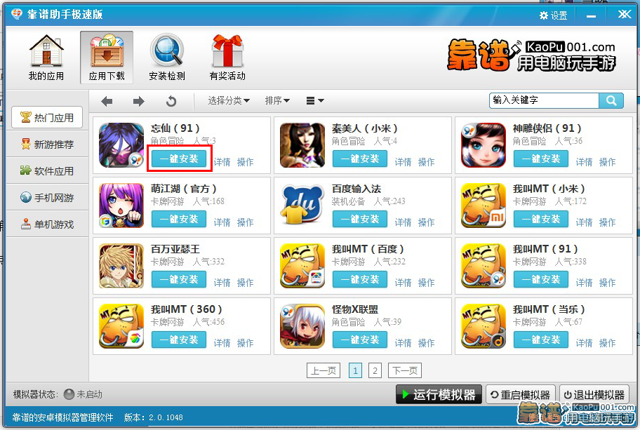 安装到我的应用之后,靠谱模拟器就会启动,这时还未完全安装好游戏,需要再次点击《忘仙》游戏图标,让游戏安装到模拟器内。即可成功启动游戏。