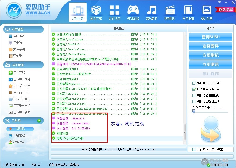 8.如果固件下载完毕,下面我们要开始刷机,点击爱思助手“工具箱”中的“一键刷机”,右上方操作栏中的“选择固件”,
