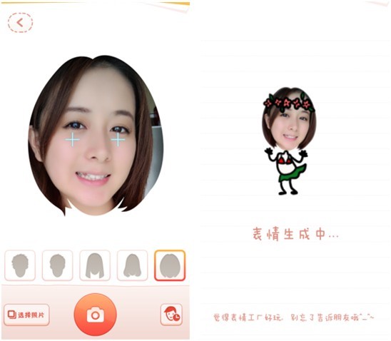 点击“动态表情”,相机启动后你可以直接从手机相册里“选择照片”,也可以现场直接拍摄一张图片,还有各种实时发型选择,如果你已经有生成过表情,也可以点击右下角的人物头像,就会出现你制作过的“历史头像”,简单又方便!