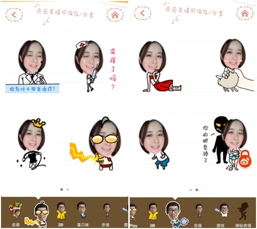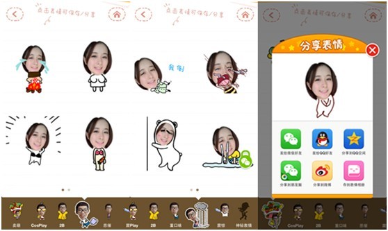 选定了头像后表情就开始生成啦,底下有卖萌、Cosplay、2B、重口味、悲催、震惊以及神秘表情等不同风格的动态图,只要点击你感兴趣的主题就可以实时预览表情效果,遇到喜欢的表情点击就能直接分享到微信、微博等社交平台,当然,如果你是个小娇羞,也可以默默的把喜欢的表情保存在“表情相册”中,自娱自乐也没什么不好的!