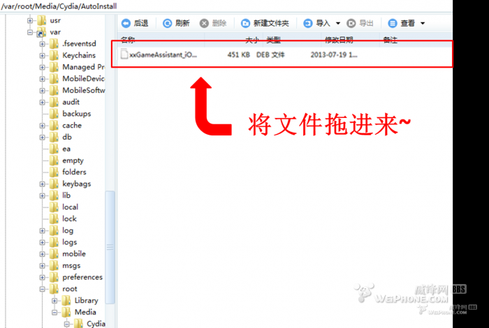 3. 手机上下载iFile等可以打开手机内文件夹的辅助工具,找到刚才拖入的文件