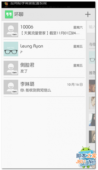 打开环聊的设置界面,进入短信功能后勾选“启用短信功能”,回到会话界面你就可以看到和环聊整合在一起的短信了。这个短信功能本身非常基础,支持文字信息及彩信,支持自定义提示音和状态栏通知,没什么特别值得称道的地方。而之所以环聊的短信功能显得与别不同,就在于环聊本身的应用优先级。