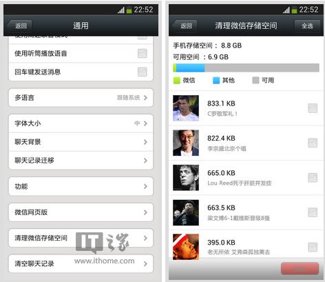 在iPhone版5.0.3先行发布之后,微信5.0.3 Android版也正式发布更新了,带来转发多条聊天记录以及清理微信存储空间等功能。