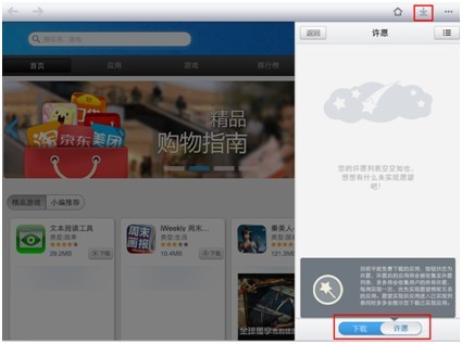 7.点击右上角的向下箭头,可进入下载列表,查看自己的下载内容,右下切换按钮,可进入许愿功能,发现想下但收费的应用,直接许愿。