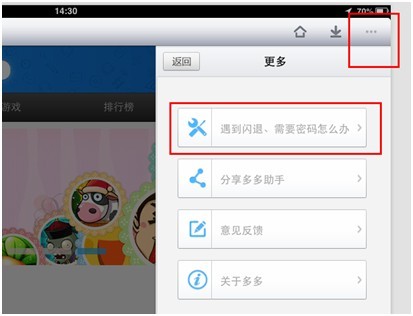 8.如果遇到闪退问题,点击右上角“。。。”进入菜单列表,再点击“遇到闪退、需要密码怎么办”。会弹出详细修复办法。