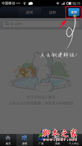 1)首先打开百度贴吧,点击进吧,再点击进群,出现建群,点击它(备注:如果是在吧内建群的话,需要吧内等级3级以上的成员才能在吧内建群);(如下图所示)
