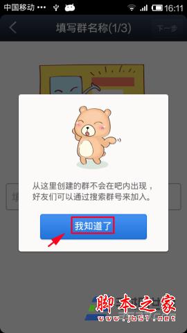 2)随后出现说明,说明从这里创建的群不会在吧内出现,好友们可以通过搜索群号来加入,点击我知道了,出现填写群名称,当填写好后点击下一步;(如下图所示)