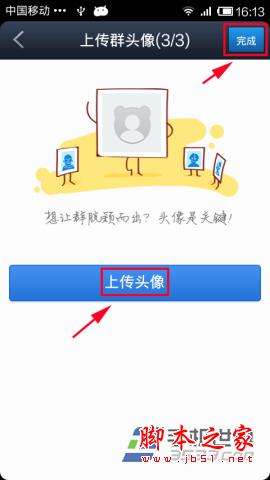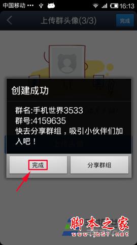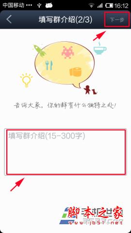 3)随后填写群介绍(注:必须填写满15个字才行,不然进行不了下一步操作),填写完群介绍后,点击下一步,这时还可以上传群头像,也可以不上传(小编选择暂时不上传群头像),点击完成;(如下图所示)
