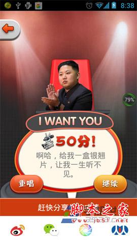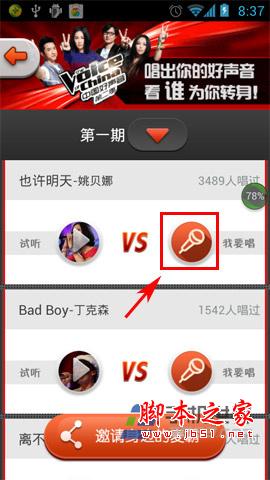 3)点击“唱出好声音,看谁为你转身”按钮进入游戏。在游戏主界面。现在推出的是“中国好声音”第一期的歌手PK。大家可以点击试听,如果要PK的话点击后面“我要唱”旁边的麦克风图标即可。(如下图所示)