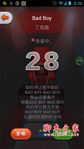 4)一般点击“我要唱”PK歌曲时录制时间为30妙,如果感觉唱的不好可以点击“重唱”,演唱完毕后点击“完成”。点击“完成”后系统将自动为你本次的演唱进行打分。(如下图所示)