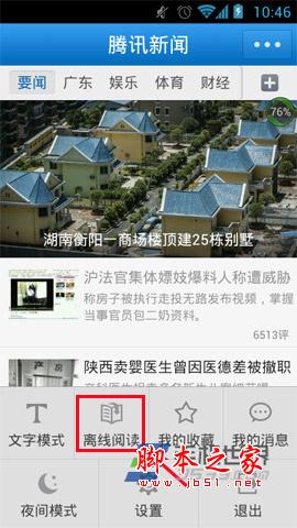 2)进入“腾讯新闻客户端”后,点击手机上的菜单键,在展开的菜单栏里将会有个“离线阅读”功能的。(如下图所示)