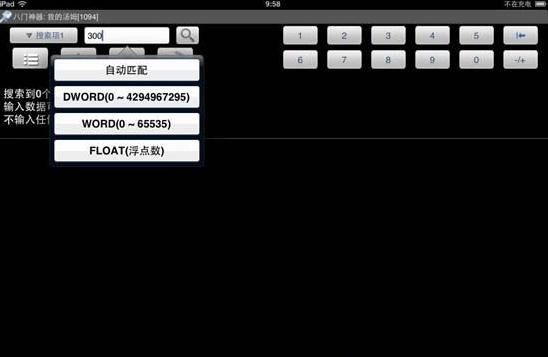 5、双击Home键,切换到八门神器,在搜索框输入现在的金币数291,点【搜索】。如下图,点击选择第一个【05F139F8】,在【数值】中输入999999,然后点击【修改】,选择【修改并锁定】并点击【确定】。
