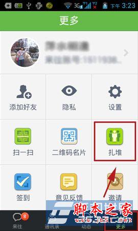 1)打开手机来往软件,进入来往后点击右下角的更多,然后点击扎堆。(如下图所示)