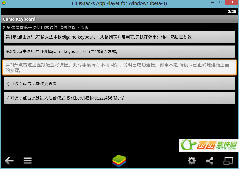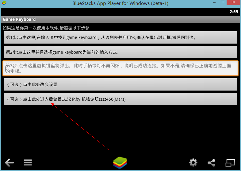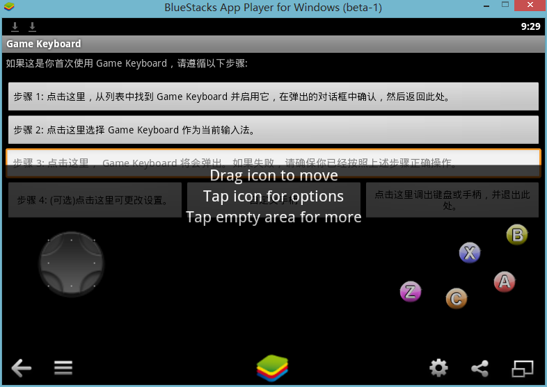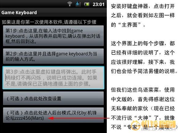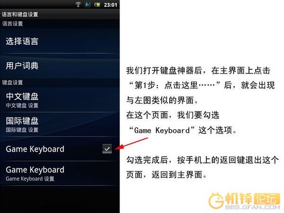 游戏前,将输入法设定为Game Keyboard(可以按键盘神器的第2步选择,按返回键退出键盘神器),再进入游戏。