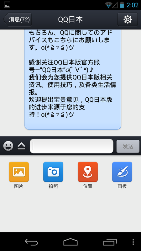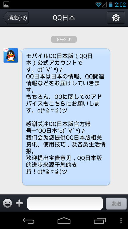 好吧,想达到以上目的,我们首先还是先来了解下这个日本版QQ到底怎么个样子?是否会有国内版本好用呢!?查了下,官方是这样说的:手机QQ日本版(Android)、是由腾讯公司和日本运营商KDDI共同为日本Android手机用户量身打造的即时聊天通信软件。此版本为KDDI日语定制版,用户可根据需要在中文和日文间进行自由切换;同时增加了中日交流、日本生活常用信息等便利指南;并提供中日两种语言的客户服务支持.
