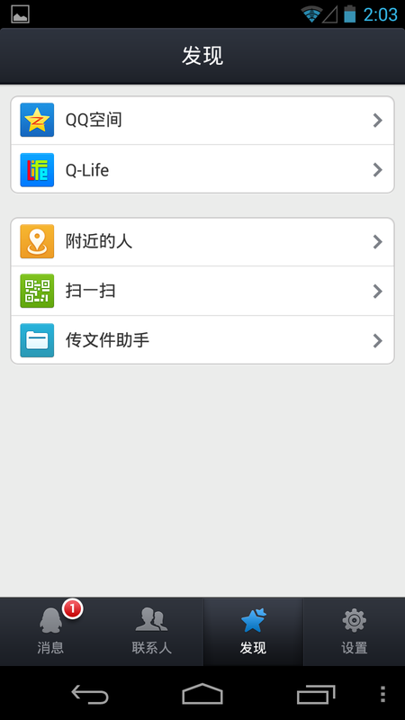 而发现这块,就是我们稍后要详细体验到的啦!同样的,日本QQ里也有QQ空间,附近人、扫一扫、传送助手。