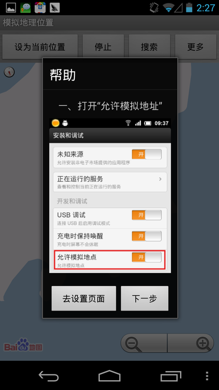 首先我们需要打开“模拟地点”,如果想偷懒,直接点“去设置页面”就能自动跳转到了。