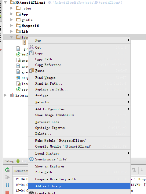 然后在libs文件夹和添加的*.jar文件下鼠标单击菜单 add as library