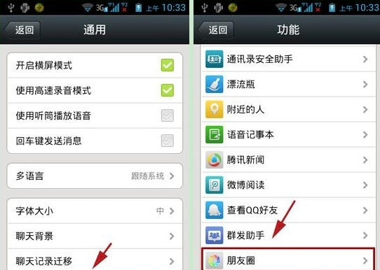 2)在通用栏找到并点击功能选项,下拉滚动,找到朋友圈,进入朋友圈功能设置。(如下图所示)
