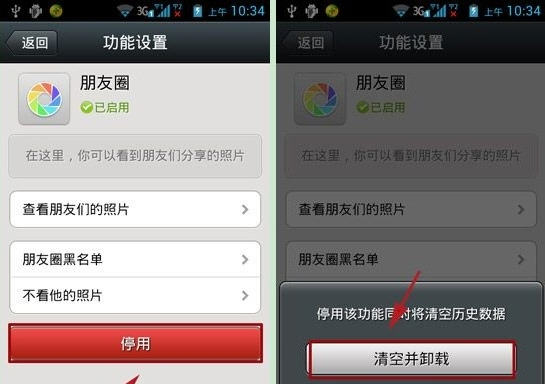 3)在朋友圈功能设置,选择“停用”既可弹出“停用该功能同时将清空历史数据”的选择对对话框,选择“清空并卸载”。停用朋友圈后,数据将被清除,所以请谨慎操作。(如下图所示)