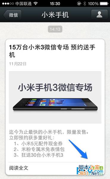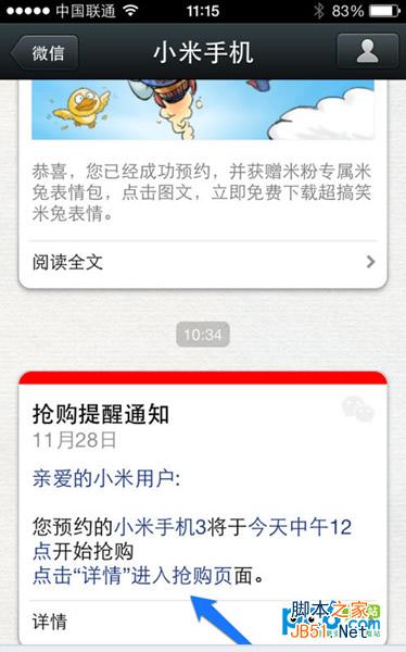 1.如果是在微信中关注过小米手机微信号的朋友,相信都会收到这样一条关于小米微信卖场的推送消息。点击此消息进入小米手机微信预约界面,如图所示