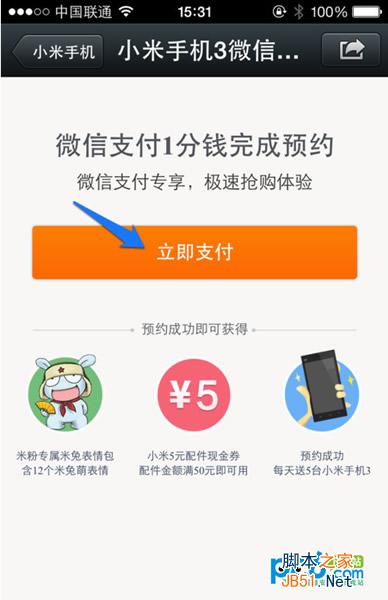 3.接下来会看到可以在微信上通过1分钱完成预约,并且还会看到通过微信预约的用户会有一些优惠礼品。点击“立即支付”按钮继续,如图所示