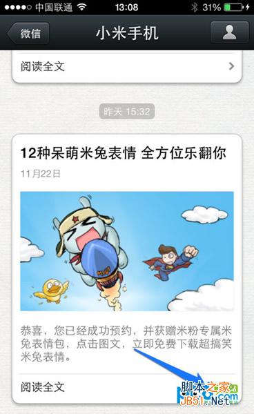 6.当预约成功以后,会收到一个小米提供的微信免费表情包,点击即可进入下载页面,如图所示