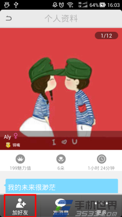 4)如果暂时对方未回应,待聊天结束后,在首页点击聊天记录列表中点击该对象进入其“个人资料,仍然可以再次点击“加好友”。(如下图所示)