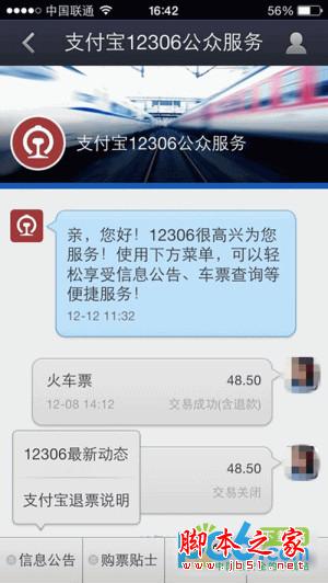 实现电脑端与手机端用支付宝购买火车票服务后,12月16日,支付宝钱包的“支付宝12306公众服务”也宣告正式开通。新上线的12306公众服务号提供了信息公告、购票贴士、列车服务和交易管理,四大菜单功能,可以让用户用手机24小时全方位获取铁路12306的信息服务。