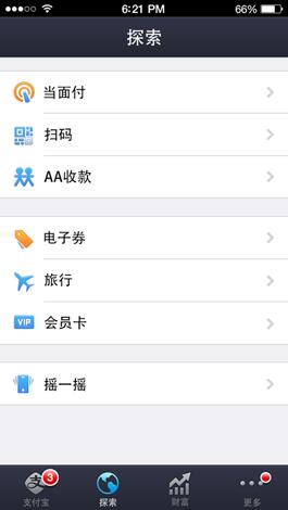 支付宝钱包会在新版中推出针对社交支付场景的“一起AA”功能。首页导航栏的四个模块由原来的“支付宝、账单、我的资产、安全”变成了“支付宝、探索、财富、更多”。这一版本为打通线上线下增加了会员卡功能,能够与商家的线下储值卡实现绑定。