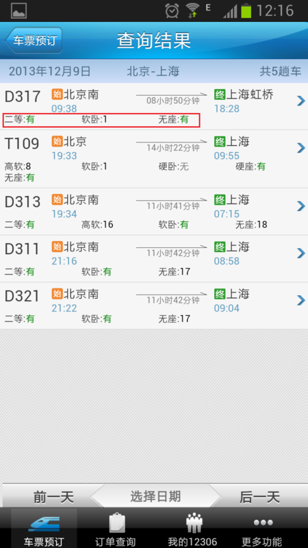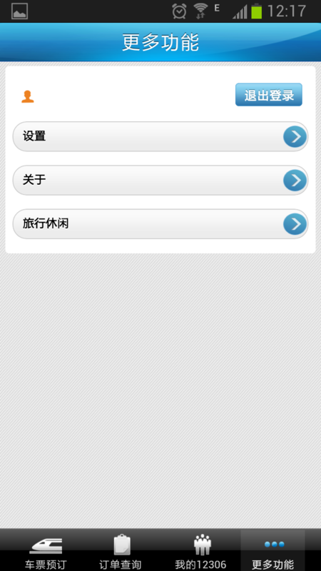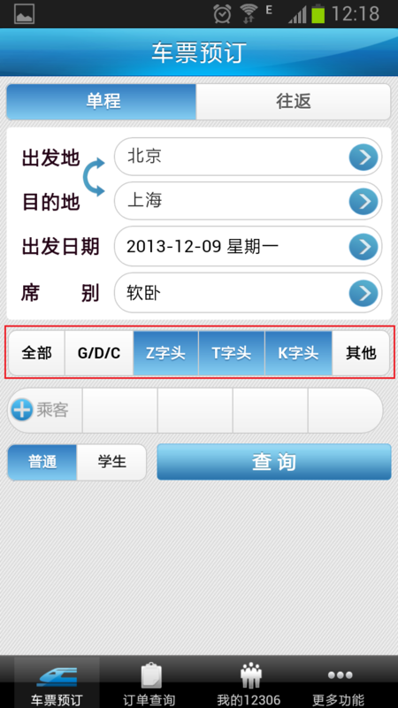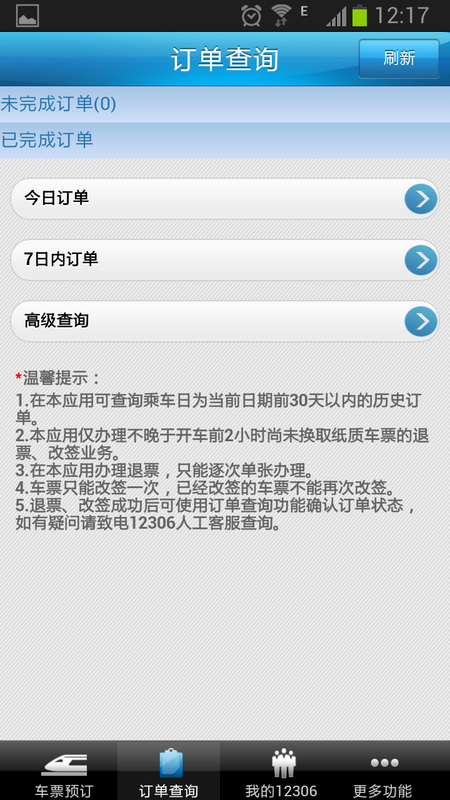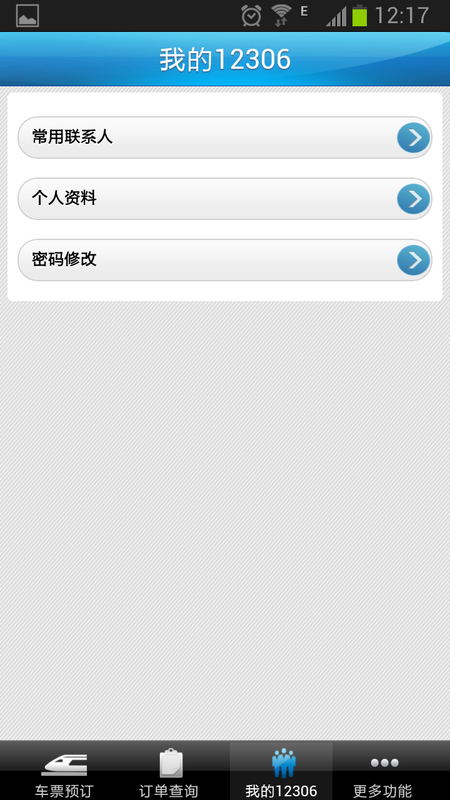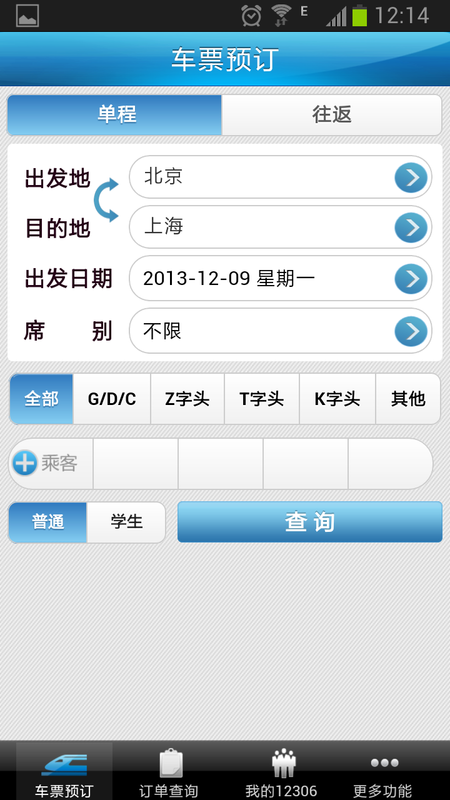 主界面分:车票预订、订单查询、我的12306、更多功能。