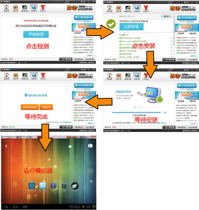 2、进行安装检测,检测通过后进行在线安装,待安装完成,弹出模拟器安装提示,开始下一步等待安装完成;