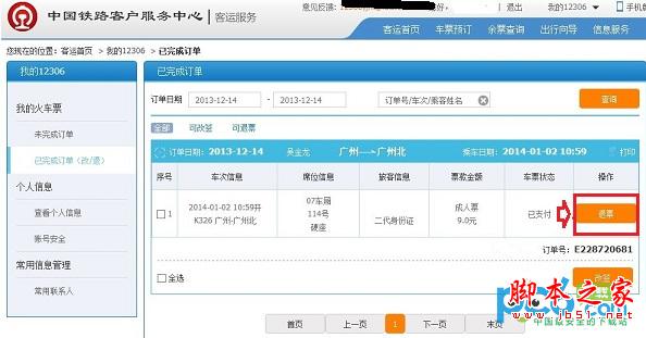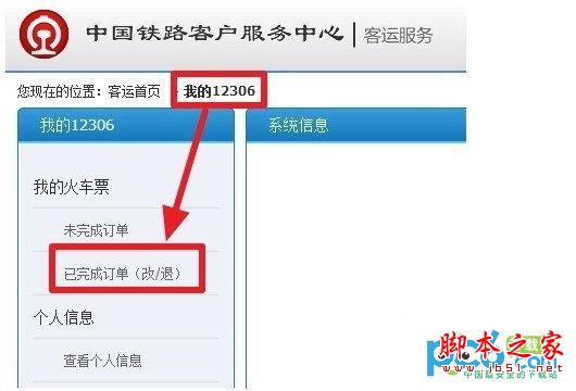 二、登录12306后,我们再点击进入“我的12306中心”然后点击“已完成订单”,如下图所示: