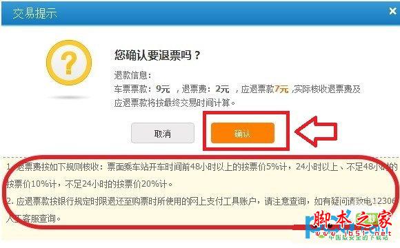四、点击退票后,接下来会弹出一个确认退票对话框,里边会提示您需要扣除相关的退票费,如果没什么疑问,点击确定即可,如下图所示:
